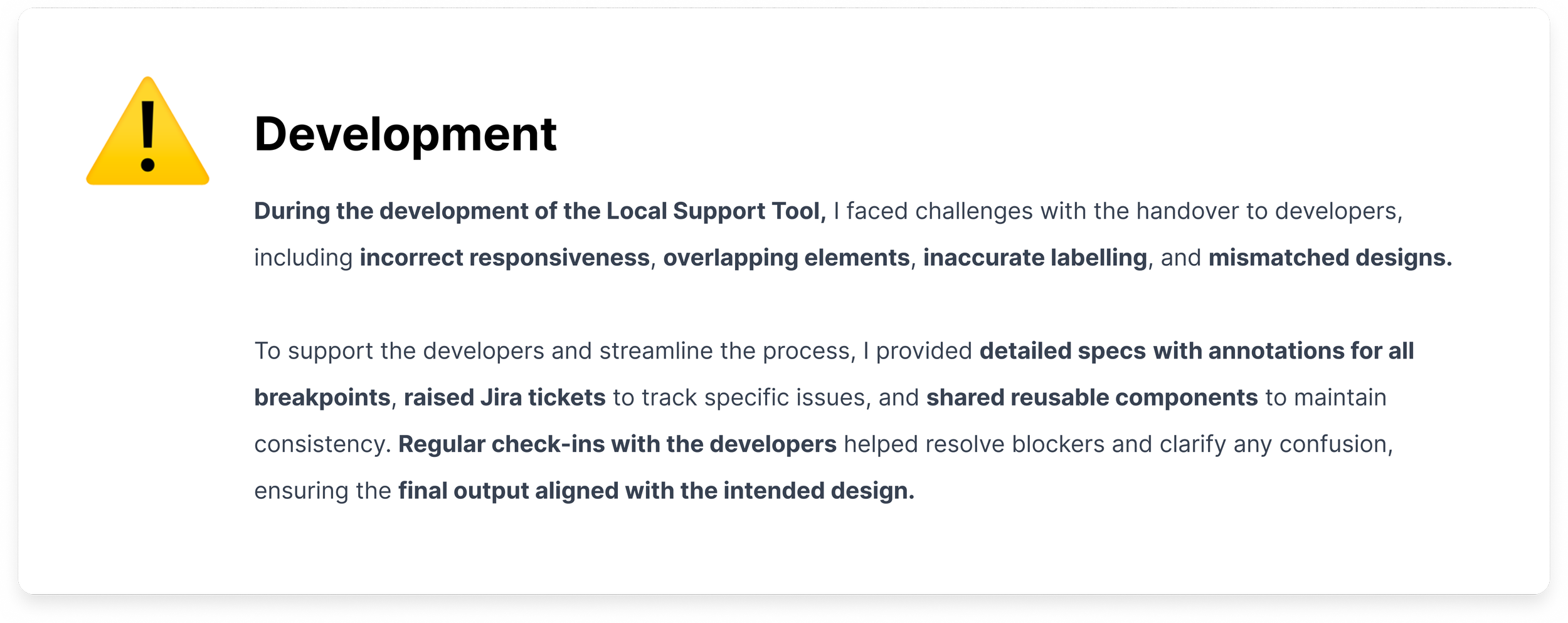 Redesigning the Local Support Tool for Parkinson’s UK taught me a lot about adapting quickly. When stakeholder feedback didn’t align with the project’s goals, I had to pivot fast, which improved my ability to iterate and make design decisions quickly. With my senior leaving mid-project, I took on more responsibility, working closely with developers and product managers to drive the design forward. I learned how to trust my own user testing data to inform decisions and realised just how crucial testing is—what works for one person might not for another, so ongoing validation is key.