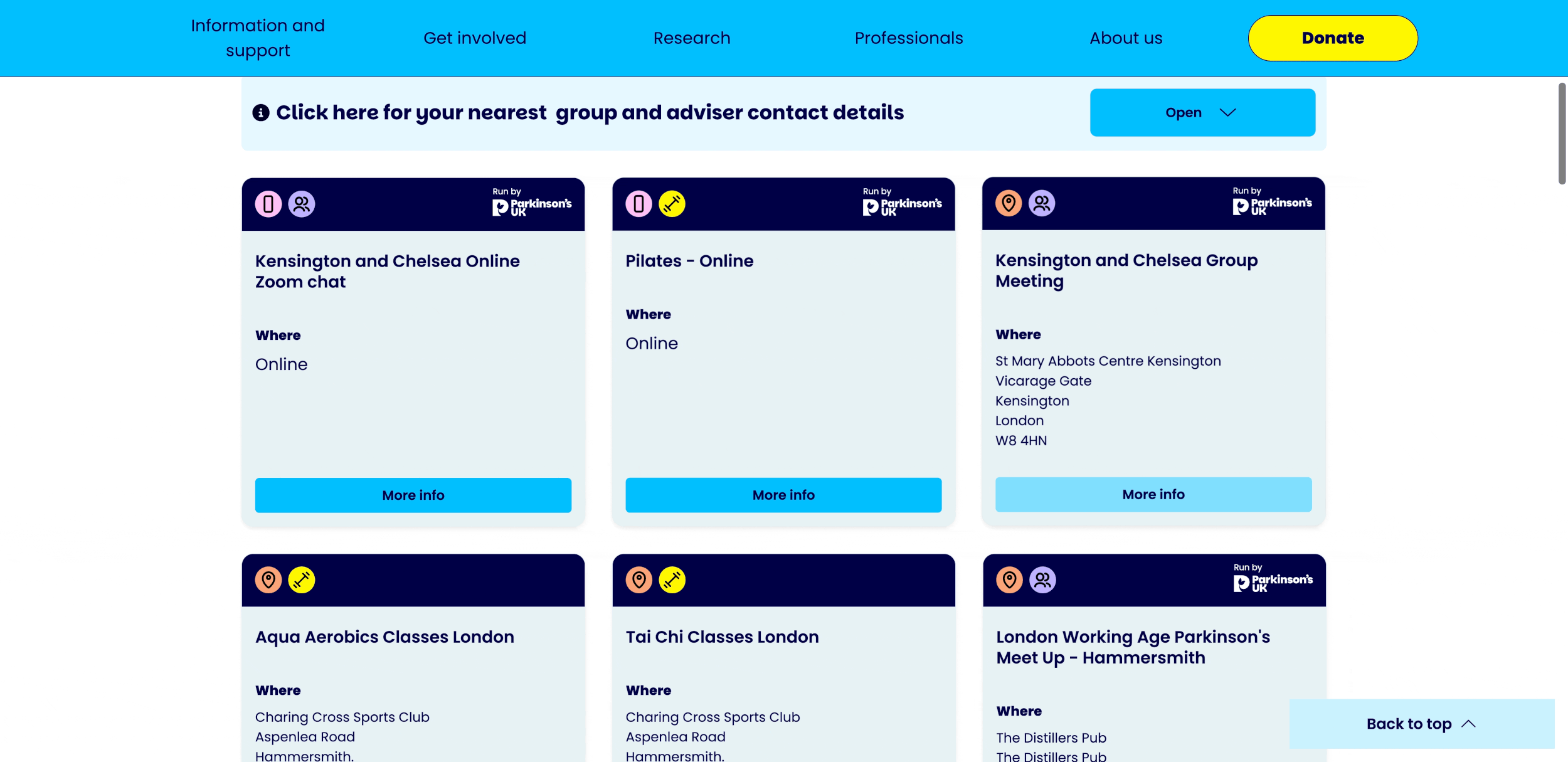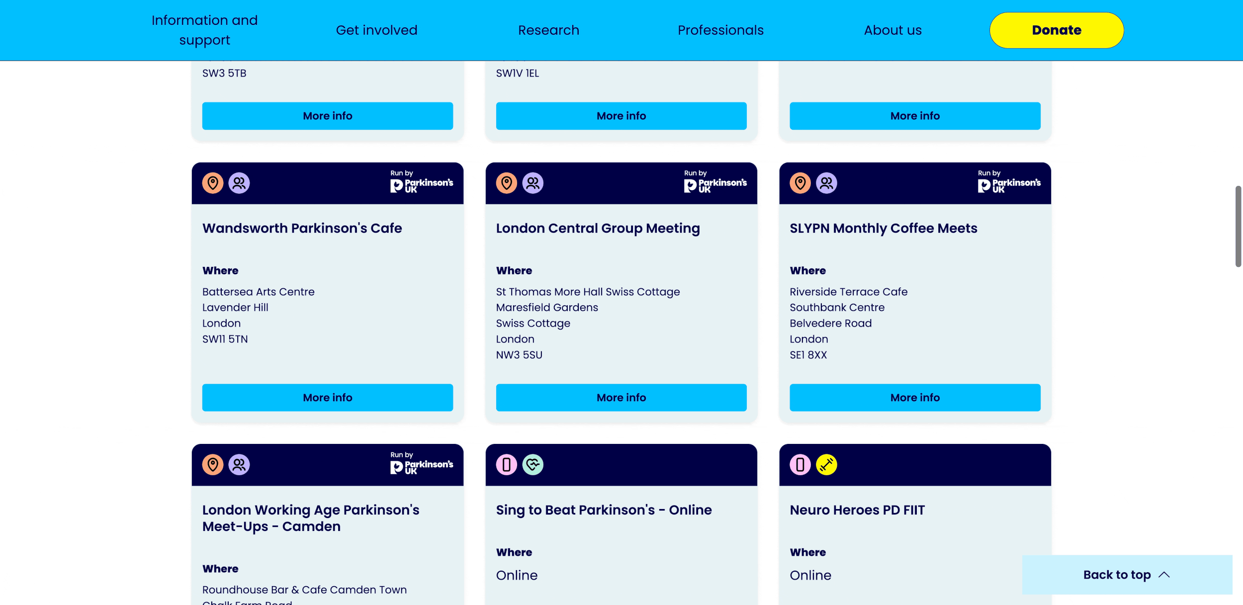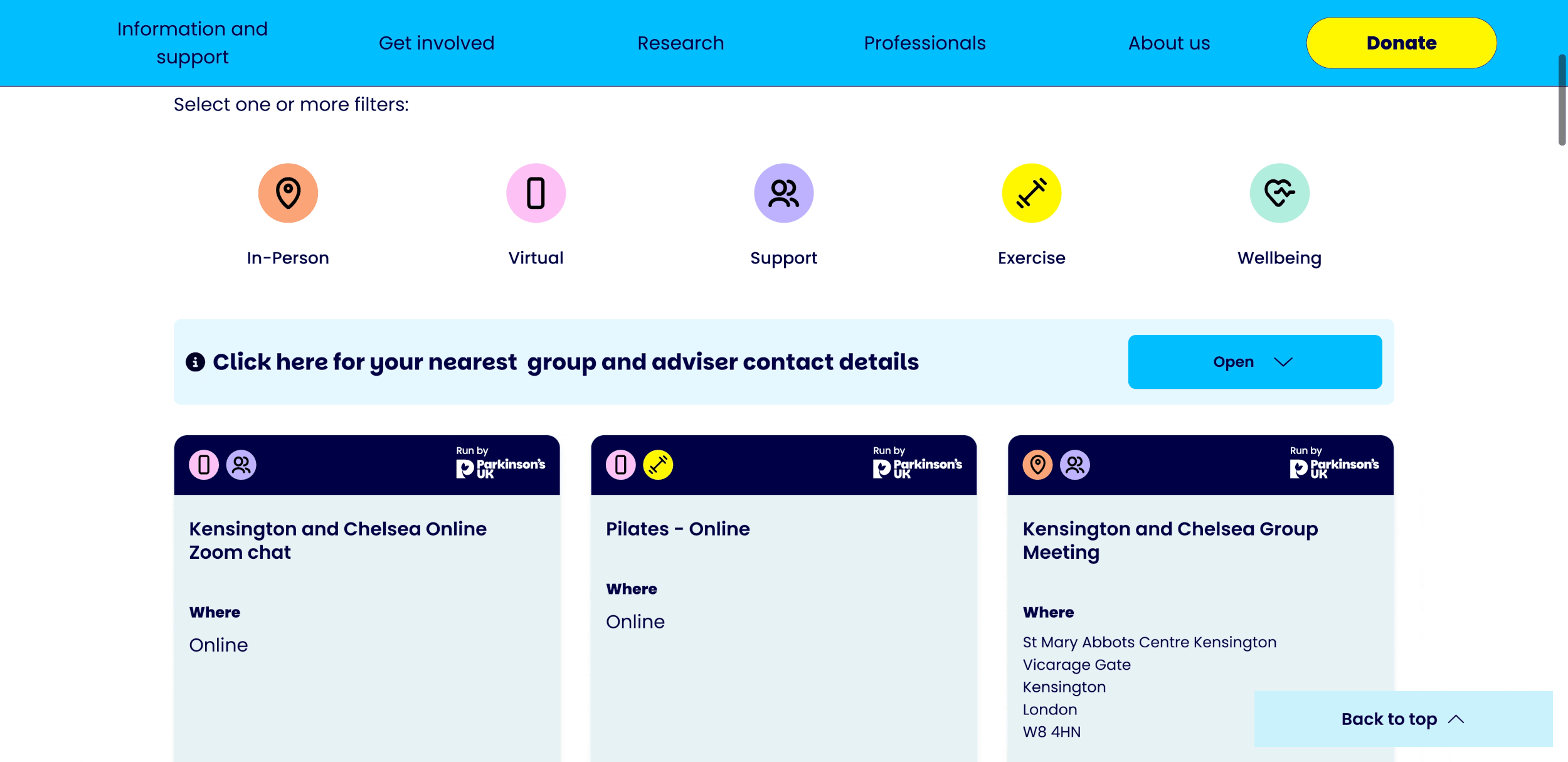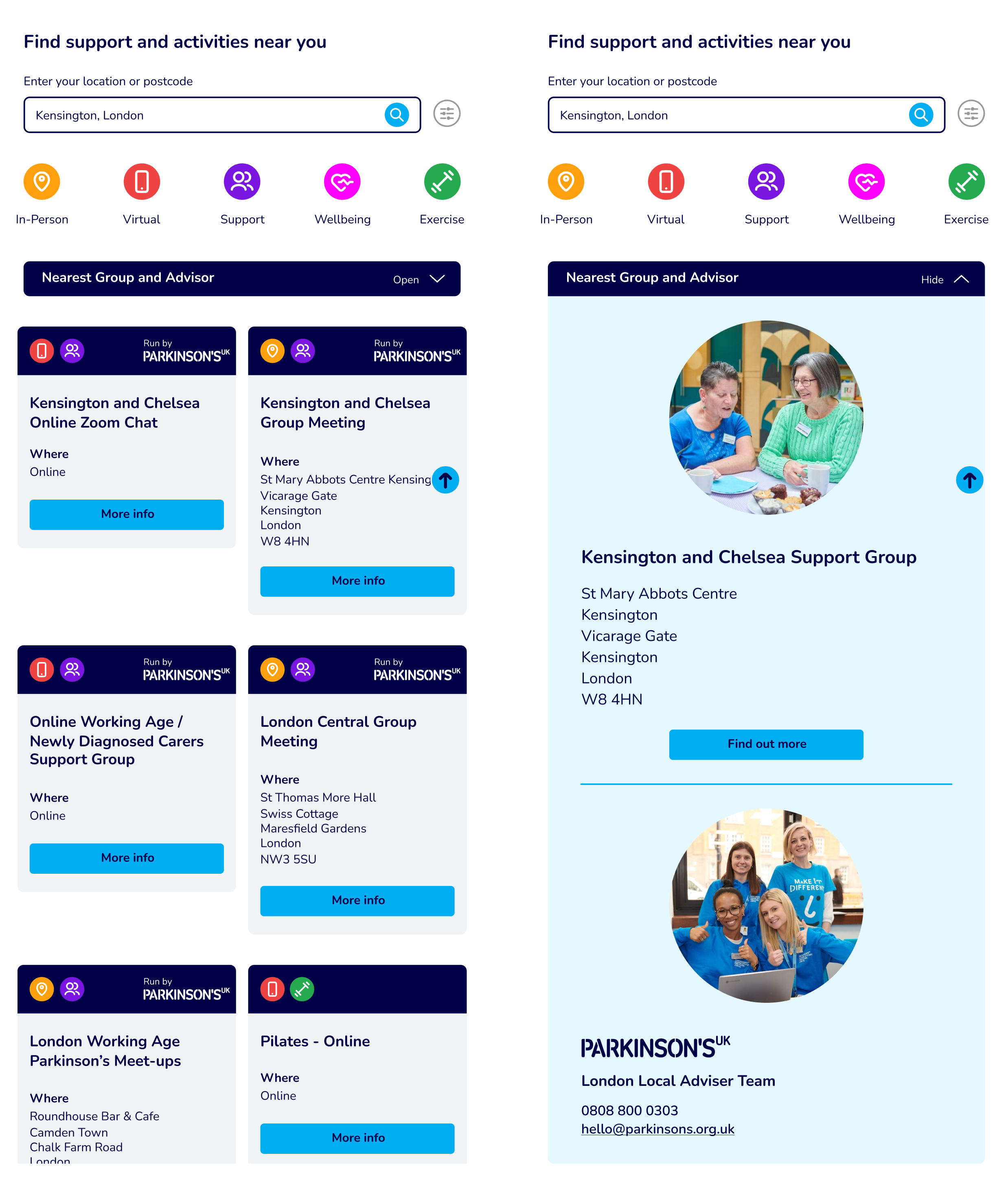As part of the redesign process, I conducted a market analysis to explore how other charities manage their local support tools and to identify features that could inspire improvements for Parkinson’s UK.