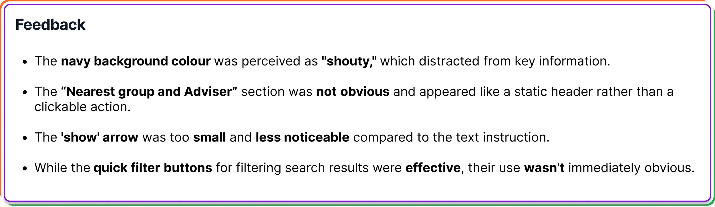 The "Open for your nearest group and adviser" section was frequently misunderstood, appearing as a static header rather than a clickable action.