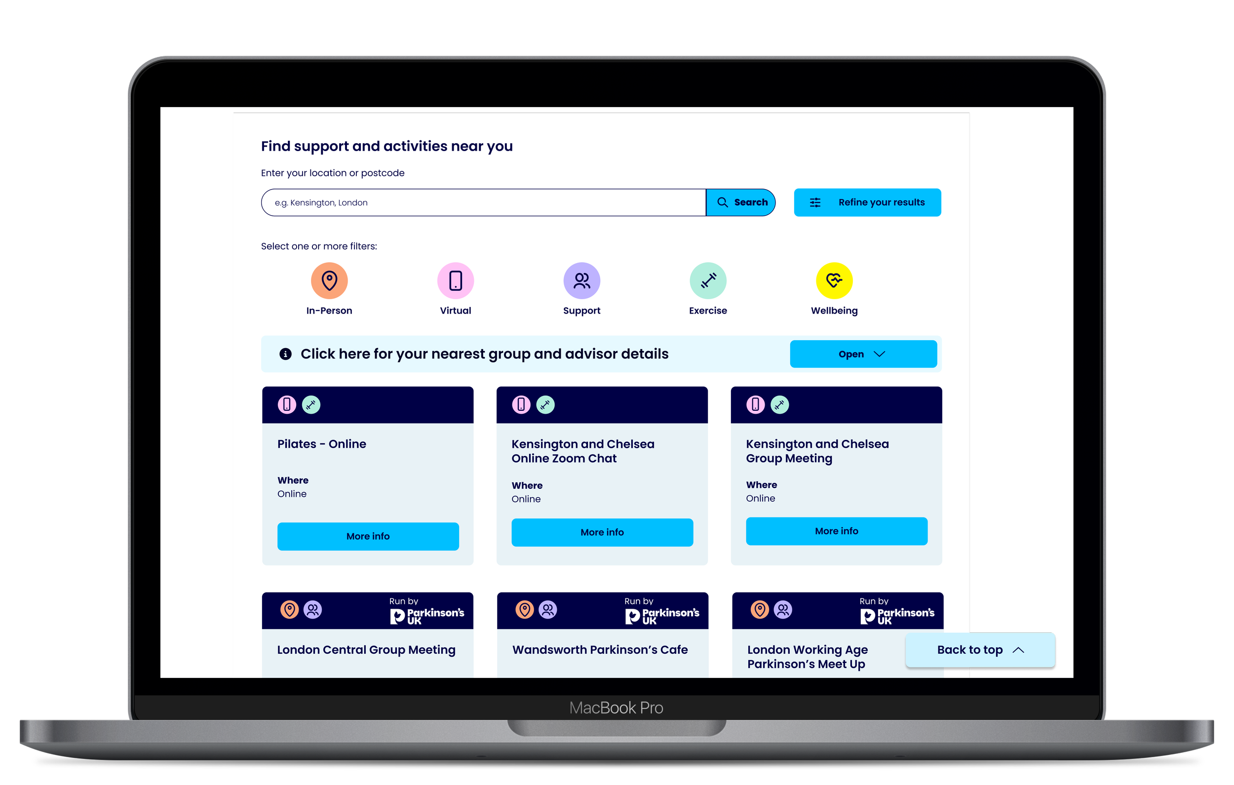 Redesigning Parkinson’s UK Local Support Group tool to enhance accessibility and usability, making it easier for users to find local groups, events, and support resources.